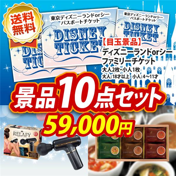 新年会景品10点セット【ディズニーファミリーチケット(大人2枚 小人2枚)、国産黒毛和牛前バラすき焼き用300g 他】送料無料!特大パネル・目録・特典付き!ビンゴや二次会景品にも!